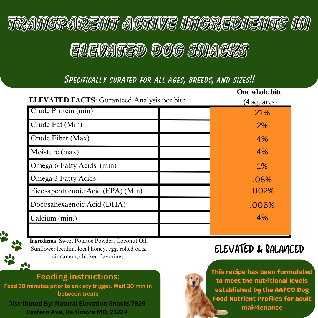 - Calm On Command: Say goodbye to stressful vet visits, overwhelming grooming sessions, and anxious walks. ELEVATED Dog Snacks are infused with calming natural ingredients to keep your pup's tail wagging in any situation.