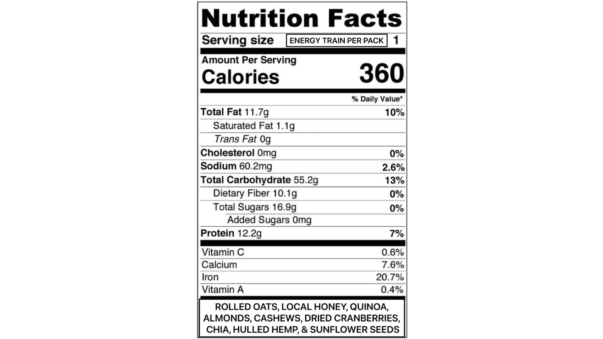 This is not just another granola bar; this is a protein-packed, energy boosting marvel that ELEVATES your snack game to extraordinary heights. Indulge guilt-free with Energy Train, made exclusively from all-natural ingredients. We've left out the artificial additives, preservatives, and unnecessary fillers. Each bar is a celebration of pure goodness, highlighting our transformation of local honey into a powerful nutraceutical that binds all of these delicious ingredients together. – a testament to our commitment to ELEVATE well-being, both mentally and physically.